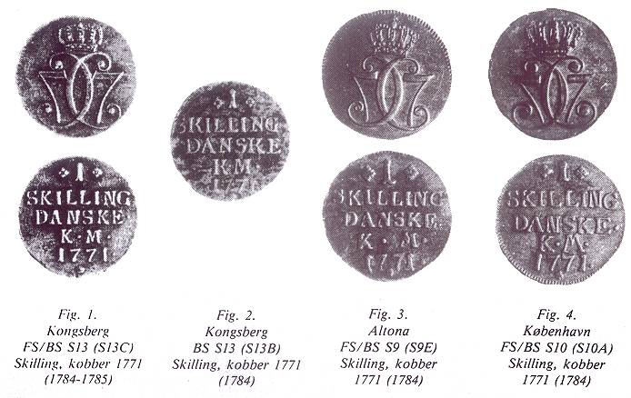 Den dansk/norske 1 skilling 1771 prægedes i årene 1771-1785 i Altona, København og Kongsberg. At en specifik mønttype prægedes ved 3 forskellige møntsteder er i sig selv ikke bemærkelsesværdigt - det var ikke ualmindeligt - nej, mere påfaldende er det, at samtlige mønter (i alt ca. 55 mill.) fremstår uden møntstedernes mærke (møntmærke), hvorved mønterne så at sige er blevet anonyme og ikke umiddelbart afslører deres rette proveniens. Med Per Lundgrens banebrydende studie (1) i 1945 og Erik Stolbergs opfølgende arbejder (2) i 1973 er dette spørgsmål dog bragt på plads.