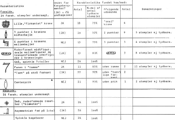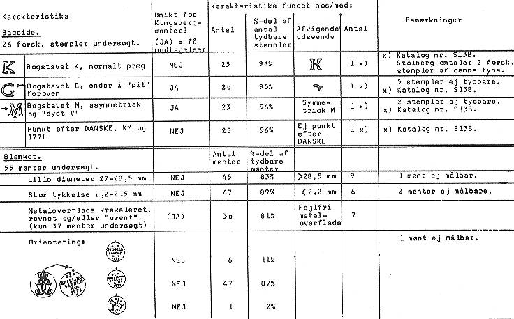 Via en detaljeret gennemgang af 55 stk. Kongsbergmønter (1 stk type S13B og 54 stk type S13C), der ialt repræsenterer 24 forskellige forsidestempler og 26 forskellige bagside-stempler, har en række karakteristika kunnet konstateres. I det efterfølgende skema redegøres herfor, idet der især er fokuseret på de detaljer, hvor Kongsbergmønterne er unike og/eller særligt karakteristiske.