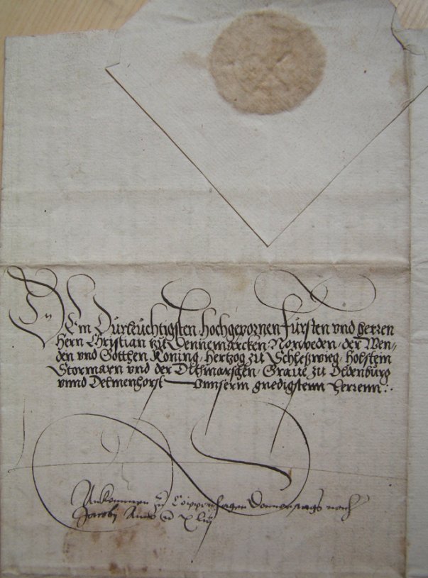 Til den durchlauchtige, højbårne fyrste og herre Hr. Christian til Danmark, Norge, de Venders og Goters konge, hertug til Slesvig, Holsten, Stormarn og Ditmarsken, greve til Oldenburg og Delmenhorst vor nådigste herre.