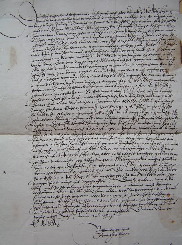 Durchlauchtigste og højbårne fyrste, stormægtigste konge, Eders kongelige Majestæt, først vil vi altid med den største iver tilsige Eder vor underdanige, ufortrødne og stedse villige tjeneste. Nådigste herre, Eders kongelige Majestæts skrivelse, vedrørende nogle penge, som Eders kongelige Majestæts møntmester Reinolt Junge skulle have stående hos den velærværdige og vise hr. Caspar Spenckhausen, vor medborgmester, og en Andreas Hinricksen, og ligeledes det håndskrift lydende på disse penge, som den samme møntmester giver udtryk for, at han skulle have lagt i forvaring hos os etc., har vi kort før dags dato modtaget med tilbørlig reverens og ærbødighed. Vi kan ikke undlade at meddele Eders kongelige Majestæt vort underdanige svar derpå, at hverken førnævnte møntmesters person eller hans handel og vandel på mindste måde er os bekendt, så meget mindre det omtalte håndskrift, og af den grund kan vi i højeste grad undre os over, hvordan det går til, at den samme møntmester omtaler os for den slags ting for Eders kongelige Majestæt. Vi har også foreholdt vor ovennævnte medborgmester Eders kongelige Majestæts skrivelse. Hans velærværdighed har givet os denne beretning, at han ikke kender ovennævnte møntmester særlig godt, men har for nogle år siden af den samme møntmesters tjener ved navn Kerstian Etiges, som nu er Eders kongelige Majestæts undersåt i Aalborg, købt nogle sild og derpå sendt den nævnte møntmester et håndskrift, som tilkom ham for disse sild. Dette håndskrift har den samme møntmester beholdt hos sig i over et år og derefter sendt det tilbage med den nævnte Kerstian, og vor borgmester har ladet ham modtage den betaling, som han fordrer af ham, og den samme betaling bestod af nogle skippund voks. Dette voks har en mand ved navn Christoffer Grønhagen, også den nævnte møntmesters tjener, modtaget og afsendt med skib herfra til Lübeck, men hvor så dette voks senere er blevet af, er han ikke klar over. Han skylder ikke den ofte nævnte møntmester noget, da han har indløst håndskriftet, som han tidligere havde udstedt, etc. Den anden person, Andres Hinricksen, som er nævnt i Eders kongelige Majestæts brev, er os ubekendt og bor heller ikke i vor by. Dette har vi ikke kunnet undlade at meddele Eders kongelige Majestæt som underdanigt svar på Eders skrivelse. Vi vil til enhver tid findes villige til inderligt at bønfalde Den Almægtige om at opholde Eders kongelige Majestæt i længevarende sundhed, lykkelig regering og evig velfærd på legeme og sjæl. Givet torsdag efter Viti anno etc. 43.