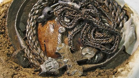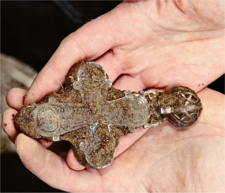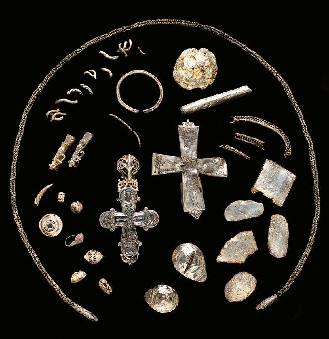 In august 2013 another hoard from the same period was found just one meter from the first one, containing 23 silver ingots, 18 of them in a bark wrapping, a neck-ring, an arm-ring, two finger-rings, a large disc brooch, and a double-sided reliquary cross of silver with remains of niello (fig. 16).
