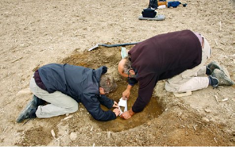Taking up the mounted specimen of the undisturbed part of the hoard. Foto: Henning Lund-Hansen , Bornholms Museum