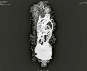 Imens blev præparatet undersøgt på Bevaringsafdelingen i Brede. Røntgenbilleder gav et første indtryk af, hvad det indeholdt, og viste, at genstandene lå tæt pakkede i en lille beholder (fig.4). Udgravningen fandt sted med træpinde, pensler og skalpel, men det mest skånsomme viste sig at være støvsugning med meget lille mundstykke (3 mm i diameter) og meget lille sug, så sandkorn for sandkorn kunne fjernes. Beholderens form tegnede sig tydeligt, da der var stor forskel på det kompakte ler uden om beholderen og den løse jord indeni.