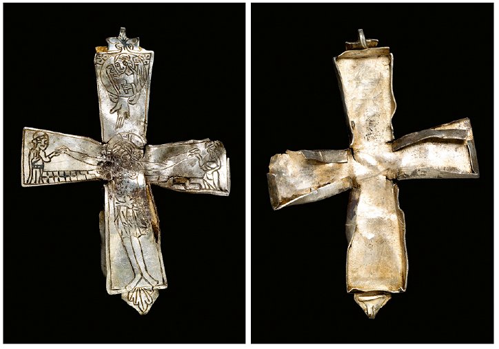 Front and back of the large cast reliquary cross from the Østermarie hoard. The cross was cast in Scandinavia, but inspired by Byzantine pectoral crosses and their traditional imagery. Foto: Roberto Fortuna 2013