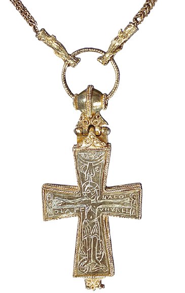 The Dagmar Cross from the royal sepulchral church of Sankt Bendt in Ringsted was made in gold and enamel in Byzantium. The dating is disputed and ranges from the eleventh century to around 1200. It is an exclusive version of the type of cross that was the model for the Bornholm cross. Foto: Nationalmuseet