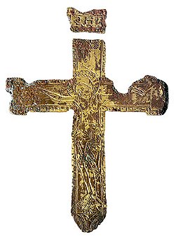 Fig. 7. For- og bagside af det store støbte relikviekors fra Østermarieskatten. Korset er støbt i Skandinavien, men inspireret af byzantinske brystkors og deres traditionelle billedverden.