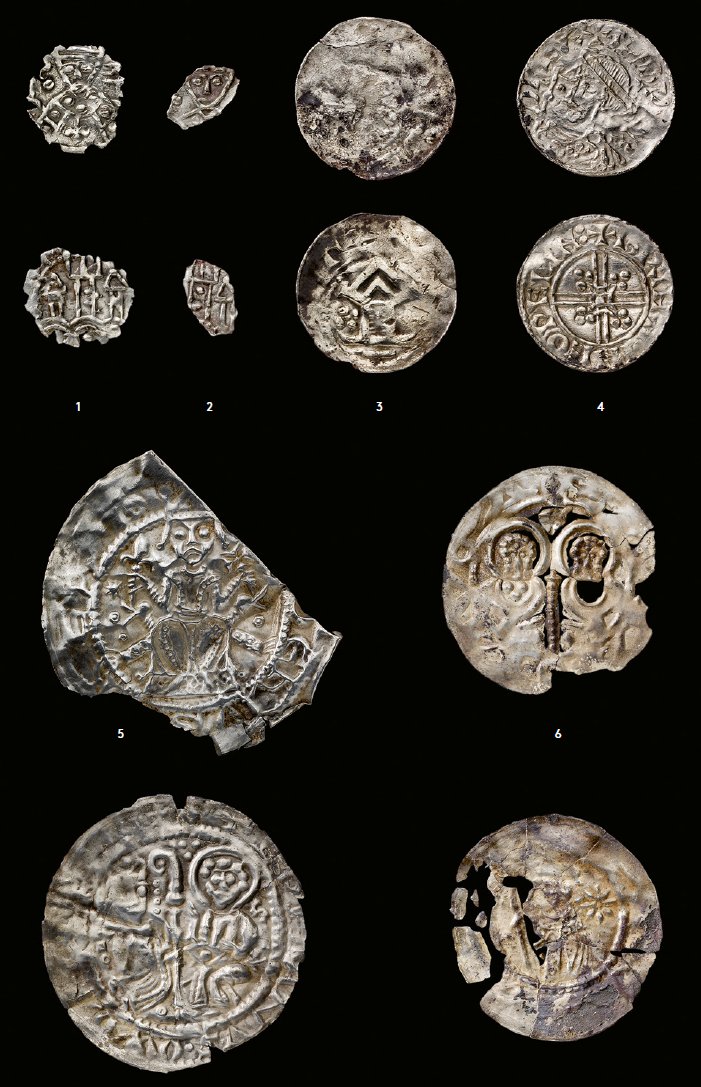 The cast reliquary cross of silver with niello inlay (fig. 7-8) weighs 245 g and has the form and iconography of a reliquary cross from Byzantium and Russia (fig. 9), but was cast in Scandinavia around the year 1100. Christ is shown as an erect, triumphant God. The second cross (fig. 10a-b) has an engraved image of the suffering Christ with inlaid niello in a mixture of German and Byzantine iconography. There are resemblances to a pectoral cross in the tomb of the Emperor Henry IV from 1106 (fig. 12) and the Danish-made gold cross from Orø (fig. 11). The hoard includes eight classifiable coins (fig. 15), as well as fragments from as many as seven other coins. The coins point to a deposition of the hoard in the 1150s. The hoard, with its mixture of hack-silver, jewellery and coins, represents the transitional monetary phase between the Viking Era and the Early Post-Viking Middle Ages. It is the youngest hoard of the Viking Era type in Scandinavia.