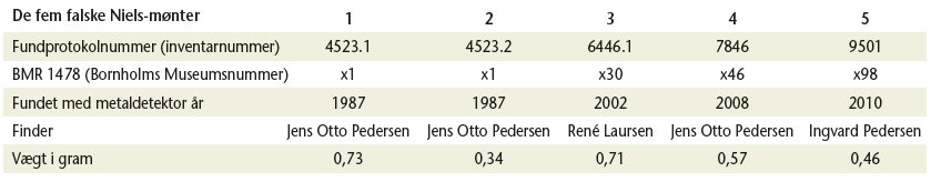 På den spændende detektorplads Store Myregård i Nylarsker sogn på det sydlige Bornholm er der siden 1987 ad fire omgange fundet fem falske mønter, se skema og fig. 1-5. Der er tale om forfalskningeraf mønttypen kong Niels (1104-1134), Lund, Hbg. 2 (1).
