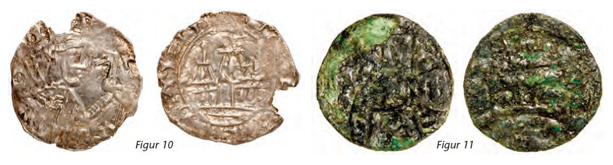 Tre (7) af disse fem mønter er Knud V, Roskilde, Hbg. 2, og de stammer fra en speciel højstatuskontekst, nemlig borgen Lilleborg i skoven Almindingen. Blot to mønter er således fra almindelige, landlige detektorpladser. Det er imidlertid heller ikke to af de mest almindelige mønter, nemlig en Niels, Hbg. 1 (fig. 10), der qua kantskaden muligvis har været brugt som smykke, og en kobberholdig/kobber-imitation af en tysk penning fra Bardowick? ca. 1100-1120, Kilger (8) 3.2.2.C (fig. 11).