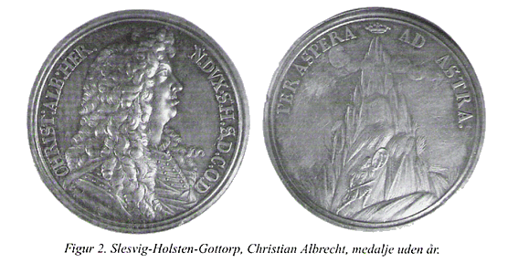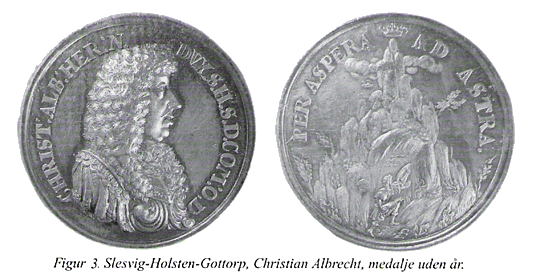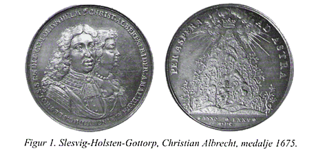 Christian Albrecht brugte også mønter og medaljer i sin sags tjeneste. 1675 var et hårdt år for ham. Den danske konge Christian V ville bruge skattepenge fra hertugdømmerne til oprustning mod Sverige, men hertugen modsatte sig. Kongen fængslede herefter hertugen, som blev tvunget til at give formelt afkald på suveræniteten. Det er i denne sammenhæng, man skal se en sølvmedalje fra dette år (fig. 1).