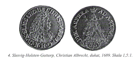 I 1689 vendte hertugen tilbage til Gottorp efter fire års eksil. Han lod da præge en gulddukat, hvor samme motiv blev taget op igen (fig. 4).