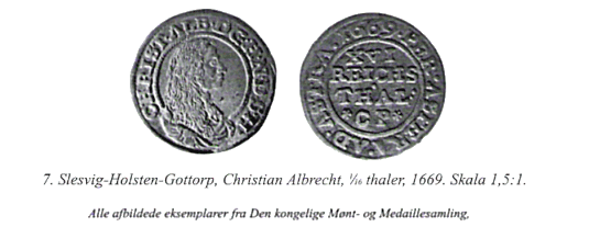 Den kongelige Mønt- og Medaillesamlings to eksemplarer er begge indgået i samlingen i 1800-tallet. Den ene blev tilbyttet i august 1841 (Bytteprotokol nr. 45.4). Den anden var blandt de mange slesvig-holstenske mønter, der i 1883 med finansiel hjælp fra den københavnske vekselerer Emile Le Maire blev anskaffet fra den hamburgske grosserer H. Mayntzhusens samling (Gaveprotokol 888) (2). De fandtes således ikke i kongens samling i 1600-tallet. Man kan ellers levende forestille sig, at den danske konge ville have frydet sig over en sådan stavefejl!