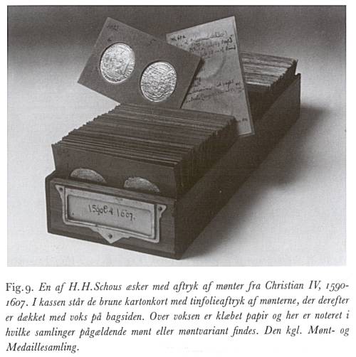 I begyndelsen af dette århundrede begyndte direktør, cand. polyt. H. H. Schou (1858-1932), som allerede da var ejer af en betydelig møntsamling, anlagt med et vidt hensyn selv til små variationer, at samle et omfattende materiale til en ny beskrivelse, der også skulle omfatte feks. punktvariationer. Han ekstraherede fra kataloger og lod afskrive fortegnelser over store privatsamlinger, f. eks. Bille-Brahe, Guildal og Hauberg, men indså ret hurtigt, at han måtte have et sikrere grundlag for sit arbejde. Han indsamlede derfor staniolaftryk af større samlinger i ind- og udland og opererede med en sådan færdighed, at han kunne tage 200 aftryk i timen og i begyndelsen af 1914 havde aftrykt henved 14.000 mønter (til sidst nåede han op på omtrent 50.000 aftryk). I sin egen samling havde han da henved 2.000 mønter, mest naturligvis småmønter og småvarianter, der manglede i Den kgl. Møntsamling. En københavnsk bladmeddelelse fra fredag morgen den 30. januar 1914 oplyste, at der påtænktes udarbejdet en ny og tidssvarende beskrivelse, der ville blive rigt illustreret og omfatte ca. 10 bind. Men der skulle endnu gå lang tid, før planen blev gennemført. Sagen blev igen rejst i 1918, og nu kom der fart på. Herom han henvises til NFM III, juni 1919, s. 90 og 108-109, samt NFM VI, december 1922, s. 220, hvorefter oplaget blev fastsat til 750 eksemplarer. Værket tryktes i forskellige afdelinger, begyndende med mønterne fra de senere oldenborgske konger for derefter at fortsætte med de ældre, der stillede større krav til nøjagtighed og anskaffelse af særlige typer til trykningen. Endelig forelå i 1926 H. H. Schou: Beskrivelse af danske og norske Mønter 1448-1814 og danske Mønter 1815-1923. En udførlig omtale og bedømmelse af værket findes i NFM X, maj 1927, s. 199-210.