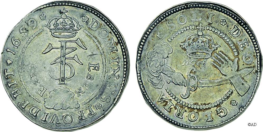 Forside: monogram, EBEN (sten) EZER, omskrift: DOMINUS PROVIDEBIT. Bagside: Gud afhugger svenskekongens hånd, der rækker efter den danske krone; Kaldet Ebenezerkrone.