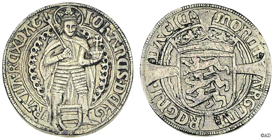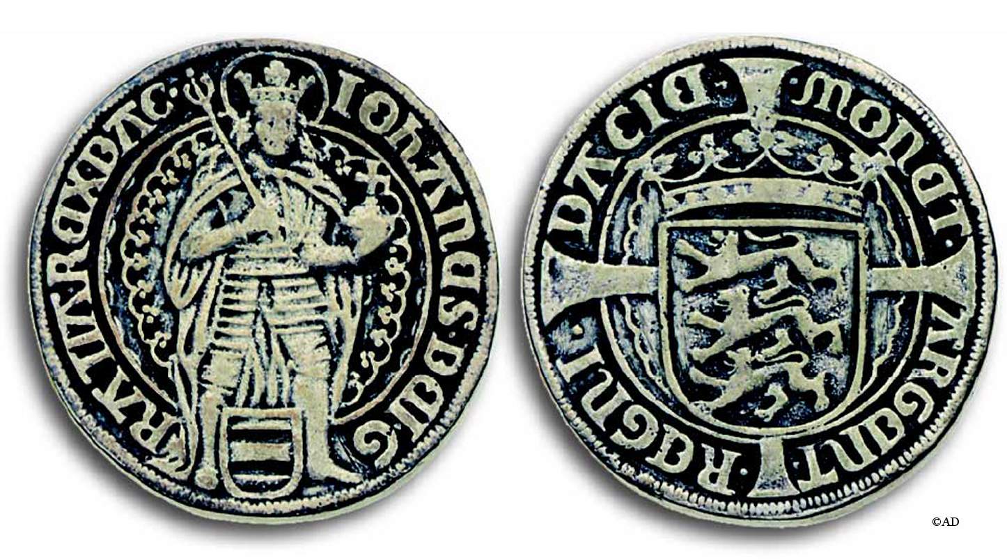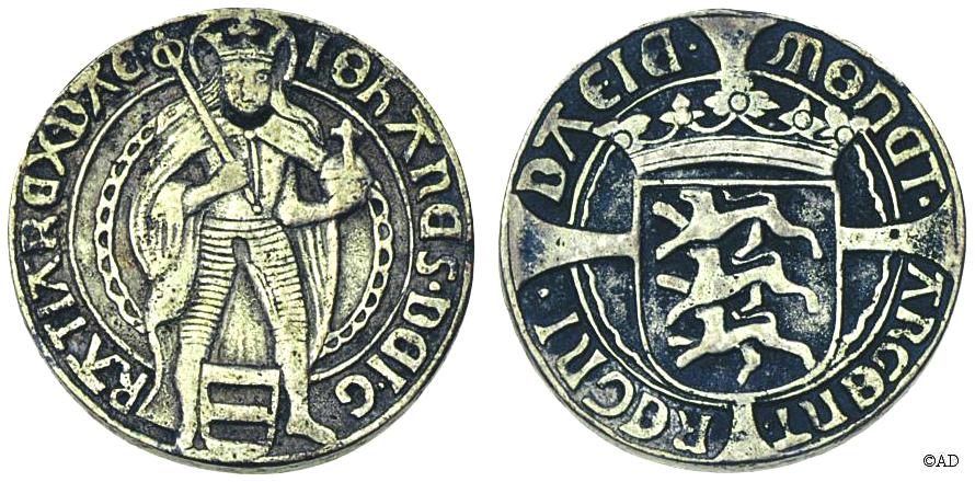 Forside: stående konge, bagside: det danske våbenskjold (Galster 253, Schou u.år 9-18)