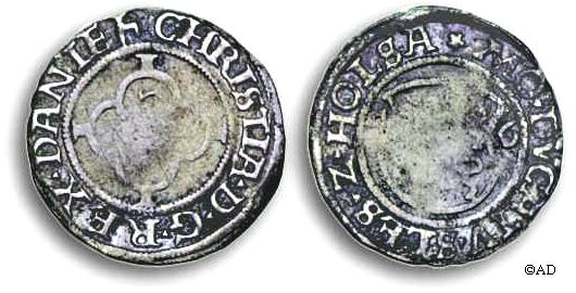 Den af mester Reynold slagne søsling 1546 har vel bibeholdt det holstenske nældeblad på forsiden og det slesvigske våbenskjold på bagsiden, men fremtræder iøvrigt som en ny type med Reynold Junges glødehage som møntmærke. Udmøntningsformlen skulle være den samme (48). (Fig. 10).