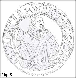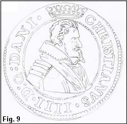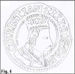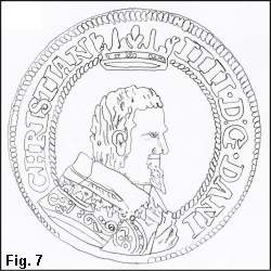 Portrættet i Fig. 6 viser igen kongen med et veludviklet fipskæg, og kraven er en udbredt kniplingskrave. Da den i Fig. 6 viste mønt er den almindeligste på trods af, at der findes flere Schounumre med portræt som i Fig. 3 (Schou 6-8) og varierende ornamentik i hjørnerne, anser jeg mønter med portræt som Fig. 3 for at være prøvemønter, medens mønten vist i Fig. 6 (Schou 5) er det færdige resultat, som er blevet slået i større antal. For 6-daleren findes også et eksemplar med portræt som i Fig. 6 (Schou 3) medens det mere ungdommelige portræt findes både med og uden ornamentik i hjørnerne. Hvorledes det forholder sig med 3-daleren er vanskeligt, idet kun en enkelt mønt med portræt som i Fig. 3 og uden ornamentik i hjørnerne er kendt. Jeg vil antage, at der også for 3- og 6-daler er tale om prøvemønter i de tilfælde, hvor der ikke er ornamentik i hjørnerne og/eller de bærer det ungdommelige portræt. Kongen har næppe accepteret cirkulerende mønt med et "forældet" portræt.