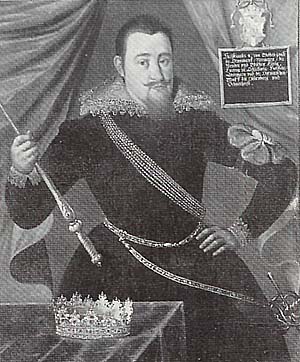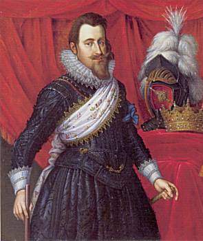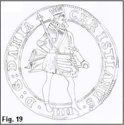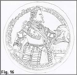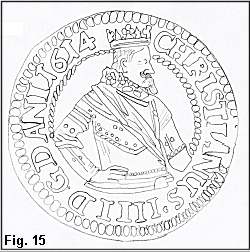 I 1611 skiftes kraven meget brat ud med en høj ret smal pibekrave, som også ses på det pragtfulde maleri af P. Isacs vist i Fig 14. Dette maleri, som blev solgt hos Bruun Rasmussen i det tidlige forår 1999, er en krydsning af det berømte portræt på Frederiksborg (se afb. i Heiberg p. 178) og det store dobbeltportræt af kongen og dronningen på Rosenborg (se afb. i Heiberg p. 88). Disse malerier angives at være fra 1611-1612, og det er interessant, at møntportrættet på specien fra 1612 (Hede Nr. 54) viser et portræt af kongen i nøje overensstemmelse med disse malerier, idet skærfet går fra kongens venstre skulder og kongen står med kommandostaven i højre hånd. Begge disse karakterer findes kun på denne ene mønt, men en rosenobel fra samme år (1612 Schou 1) har dog også skærfet fra kongens venstre skulder. Disse to mønter fra 1612 vil jeg tilordne portrættype 6a. Næsten alle andre mønter fra denne tid har et skærf fra kongens højre skulder, og kongen har på de fleste mønter den højre hånd støttet på hoften som vist på Fig. 15 (mark 1614, Hede Nr. 99). På Rosenoblerne (Hede Nr. 23 og 24) holder kongen en stav (scepter ?) i den venstre hånd og på specierne fra 1618-1620 (Hede Nr. 53C) holdes scepteret i højre hånd (og rigsæblet på venstre). Portrættypen med den høje pipekrave og skærfet fra kongens højre skulder vil jeg betegne med type 6. Bortset fra den nævnte specie fra 1612, rosenobelen 1612 S.l og ungersk gylden 1611 (Hede Nr. 17) ses denne portrættype på samtlige portrætmønter frem til 1617 og videre frem til og med 1620, hvis man ser bort fra den i 1618 nyindførte kronemønt. Desuden ses denne portrættype også på Kalmarmedaljen fra 1611 (se Fig. 16). Kalmarportrættet, som tidligere er blevet sammenlignet med N. Schwabes breddaler (se kommentar til Hede Nr. 64), skiller jeg altså skarpt fra breddalerens på grundlag af kraven, og der må efter min mening være mindst et år mellem breddaleren og Kalmarmedaljen alene på grundlag af portrættet. Som omtalt ovenfor mener jeg faktisk, at der er 3-4 år mellem disse to portrætter.
