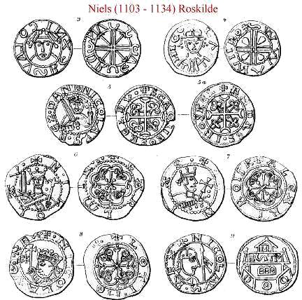 Det er ikke særlig rige Minder, der paa Myntvæsenets Omraade ere efterladte om de 31 Aar, i hvilke Niels førte Regjeringen (1103-1134). Ialt kjendes kun 14 Mynttyper fra denne Konge; deraf tilhøre 2 Lund, 7 Roskilde, 2 formentlig Viborg og 3 Ribe.