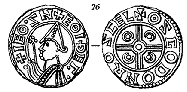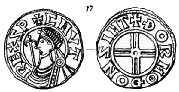 2 Udmyntninger fra Lund (T. II. 23. Var.) bære Ethelreds Navn. Det er tidligere berørt, at dette Navns Forekomst her vistnok kun skyldes Friheder fra Stempelskjærernes Side.