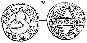 Triqvetrafiguren findes anbragt paa northumbriske Mynter fra Eadberht (197) En beslægtet Figur ses paa sildigere tyske Mynter fra Andernach (198).