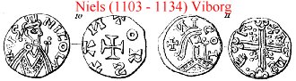 Der viser sig tillige en ny Indflydelse paa Myntvæsenets Omraade, idet der optages nye, fyldige Reversfremstillinger, der ere hentede fra engelske Mynter. Myntprægenes i det Hele smukke og fine Tegning ødelægges imidlertid ved en stærk Tilbagegang for Udprægningens Vedkommende. De tynde, skjødesløst tildannede Blanketter, ofte med en uregelmæssig og hakket Rand, ere for flere Udmyntningers Vedkommende kun tildels udprægede, og navnlig ere Omskrifterne i høj Grad mangelfulde. En lignende Tilbagegang spores iøvrigt ogsaa paa engelske og tyske Mynter fra denne Periode. Den engelske Paavirkning paa det danske Myntvæsen staar muligvis i Forbindelse med Indkaldelsen af den engelske Guldsmed Anketil. Et Revers- og et Adverspræg fra Mynttyperne under Niels (T. XIII. 2. 9) overføres senere til England og benyttes paa Kong Stephans Tid, 1135-1154 (250). Ved Siden af den Udvikling, der saaledes finder Sted, bevare Udmyntningerne fra Viborg deres tidligere Reversfremstillinger; paa den ene af disse anvendes en gammel Typ (T. XIII. 11) fra Ethelreds Udmyntninger, der findes benyttet i Danmark lige fra Knud den Stores Tid.