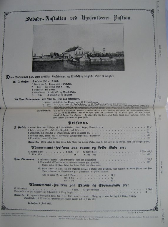 Svømmebade en heel Maaned til Afbenyttelse 1 Gang daglig 2 Rbd. Anmærkn. De logerende Badegiester betale kun 2/3 for Bader naar det tages 1 Gang, og ½ naar det tages 2 Gange daglig. Haandklæder til Strøm- og Svømmebade betales med aparte med 4 ß pr. Stk.