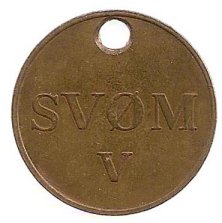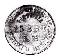 Et betalingstegn med tekst: K. B. 35 øre, For 1 Voxen; Strömbad med Haandklæde- afleveres til Badeopsynet. Efter typen må det være fremstillet i Tyskland. Tegnet har en skråstreg over O således at det læses som et Ø. Mærket må formodes at være fabrikeret i Tyskland før 1914.
