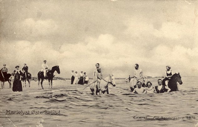 Hestene havde ikke spor imod at få et havbad. De badende var, ærbart, indhyllet i badetøj. På dette herlige badebillede ses en gruppe badende. Karlene havde spændt hestene for den stive arbejdsvogn, og så kørtes til Marielyst for at få et havbad.