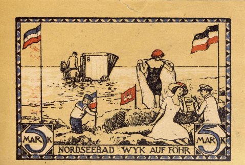 Fig. 30. Badescene gengivet på en 5 Mark pengeseddel fra Nordseebad Wyk Auf Föhr