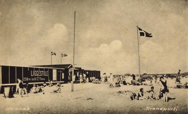 På et postkort fra ca. 1930 fra Hornbæk ses priser på leje af liggestole malet på et plankeværk: 25 Øre for 2 timer.