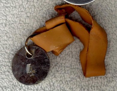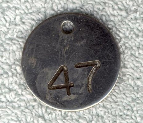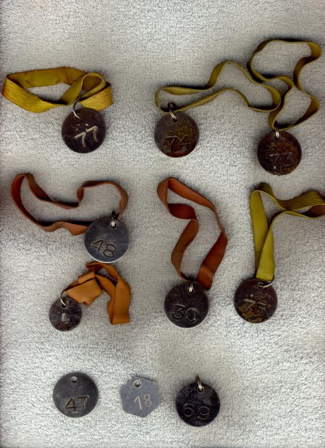 Fig. 43, 44, 45. 48 med et rødt gummibånd, til herrer. Skilt med 4 med rødt gummibånd er brugt i Sjællandsgade badeanstalt ca. 1959 som garderobemærker. Mærke med 18 i aluminium er brugt i Frederiksberg svømmehal. Alle mærker foræret mig den 10.11.1969 på Sjællandsgades Badeanstalt Nørrebro