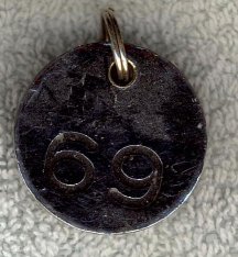 Fig. 46. 18.03. 1970. Skilt med 69 indslået fra Lyrskovgades Badeanstalt København. V. Garderobeskilt til deponering af tegnebog og ur.