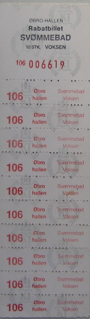 Fig. 49. Øbro-Hallen Rabatbillet SVØMMEBAD 10 stk VOKSEN, hvid 1979 Slotsportner Jerry Meyers samling af danske pengetegn DKM&MS bons side 30