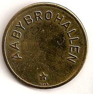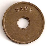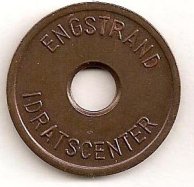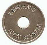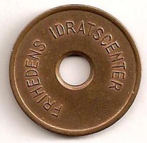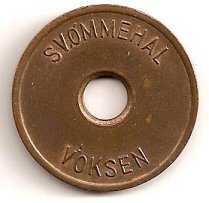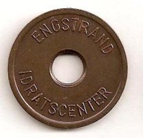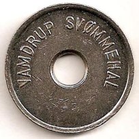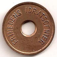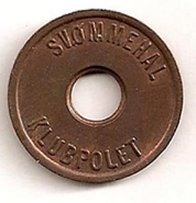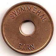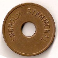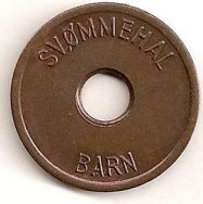 Fig. 53, 54. ENGSTRAND IDRATSCENTER BARN SVØMMEHAL 6 mm. hul, 25,5 mm. Kobber. Barn 3 kr. Marts 1980