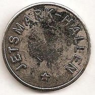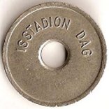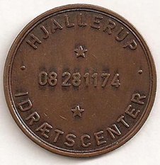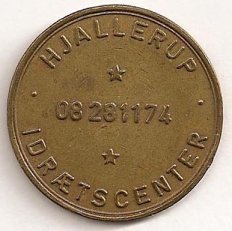 Fig. 74, 75, 76 MEKA indslået HJALLERUP 08281173 IDRÆTSCENTER kobber og messing. Messing voksne 8 kr. kobber børn 5 kr. 22.02. 1982 er det mig oplyst: at mørke poletter (kobber) = voksen 8 kr. Lyse poletter (messing) gælder for børn 5 kr. Der er præget 500 stk. af hver, ibrugtagen den 01.08.1977