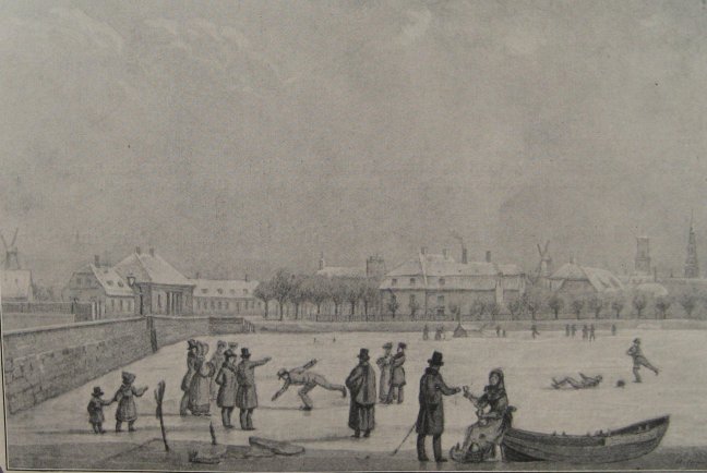 Fig. 105. Skøjteløbere på Peblingesøen set mod Nørrebroe’s Ravelin-Alléer, H. F. G Holm ca. 1840