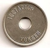 Fig. 107, 108. ENGSTRANDS IDRATSCENTER hul 6,5 mm. ISSTADION VOKSEN, hvidt metal 26 mm. Voksen 7 kr. marts 1980