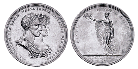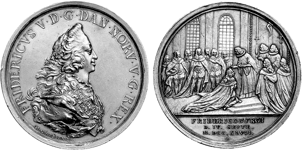 Den første danske mønt med en konge og dronning afbildet er fra Valdemar den Store, Hbg. 25-28. Her ses to personer, ganske uden portrætlighed. På Frederik 1.s Nobel 1532 (her som afslag i sølv til værdi af halvanden sølvgylden) ses kongen og dronningen, fig. 017.
