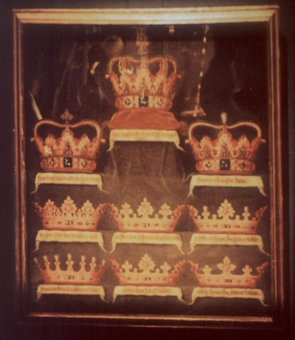 Mange af vore kongers kostelige skatte findes i rigt mål på Rosenborg Slot. I Grønne kabinet ses en montre med ridetøj fra Christian 4. genbrugt til tronfølgeren, den udvalgte prins Christians bryllup i 1634. Mus. nr. 3010. Ridetøjet er broderet med guld, juveler og perler. Arbejdet er udført af Gert Osserjn i København med genanvendelse af ældre smykker. Christian 4.'s krone havde 4 bøjler! Her vises 5. Frederik 3.'s krone har i 1648 6 bøjler. Når man ser denne krone forfra ses 5 bøjler. Fra 1656 ses en 8-bøjlet krone på mønter. Fra 1665 er der 8 bøjler på kronen. Tager man antallet af bøjler på kronen som rettesnor, da må, i det mindste, denne krone være den 6-bøjlede krone fra 1648. Fig. 175.