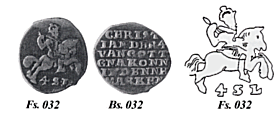 Især fra Glückstadt findes flere mønter efter 1624, hvor der ikke er en bøjle over kronen På 4 skilling Lybsk u. år ses rytteren med en bøjlekrone. 1/4 portugaløser H 30 fra 1629 har en krone uden bøjle. På en medaille, G 73, ses samme tekst og krone. Den unikke 16 skilling fra 1625 H 138, har ikke bøjle. på en 4 skilling lybsk H 167 u.å. ses kongen med en bøjlekrone. Er denne hovedbeklædning en lukket bøjlekrone, må mønten være slået efter 1624, fig. 032.