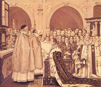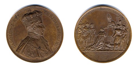 Christian 4. krones den 29. august 1596 i Københavns Domkirke, Vor Frue kirke. Efter fire timer er kroningsceremonien forbi, og Christian rider mod Københavns Slot. På en senere medaille ses kongen ridende med krone og holde scepteret i hånden. Æblet bliver båret af en af rigsråderne, fig. 022, G 34. På Frederiksborg Slot hænger et maleri der forestiller denne scene. I en vinduesåbning ses brygger Carl Jacobsen, kunstneren har anbragt den store danske mæcen som erindring om, hvem der betalte for genopbygningen af slottet. Midler til genopbygningen forsøges rejst gennem en folkeindsamling. Frederik 7. lovede at give, dobbelt bidrag af folkets gave. Alle disse forsøg led skibbrud. Først da bryggeren tog initiativet kom der gang i byggeriet.