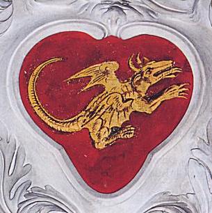 Christian 1.'s første kronede våbenskjold fra 1460, hvor han bliver hertug til Slesvig og greve til Holsten. Skjoldholderne er en kvinde og en vildermann. Her ses to skjoldholdere uden køller på et kalkmaleri. ES s. 85; fig. 012.