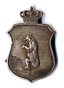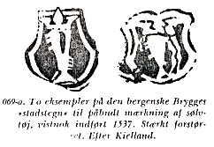 "Bortset fra det med byens våben forsynede tinskilt fra 1687 beskrives her det første polititegn". Carl Aage Redlich.