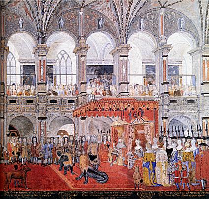 På maleriet ses den herlige møntscene med de to herolder, som kaster penge i grams til folket .