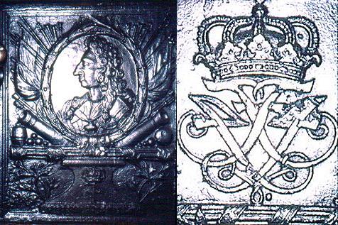 Bilæggerovn med Frederik 4.'s portræt og navneciffer. Fra Samsø, museumsgården og saltsyderiet.