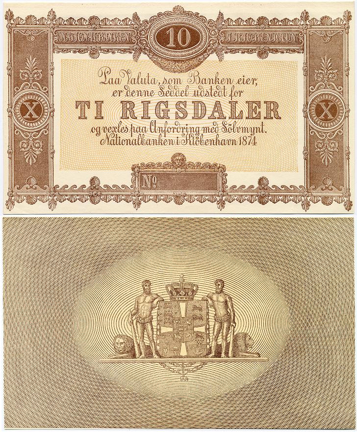 På en 10-rigsdalerseddel fra 1874 ses det store kongevåben, uden baldakin. De to skjoldholdere har fået selskab af to løver. Bilag til nationalbankens Historie, fig. 184.