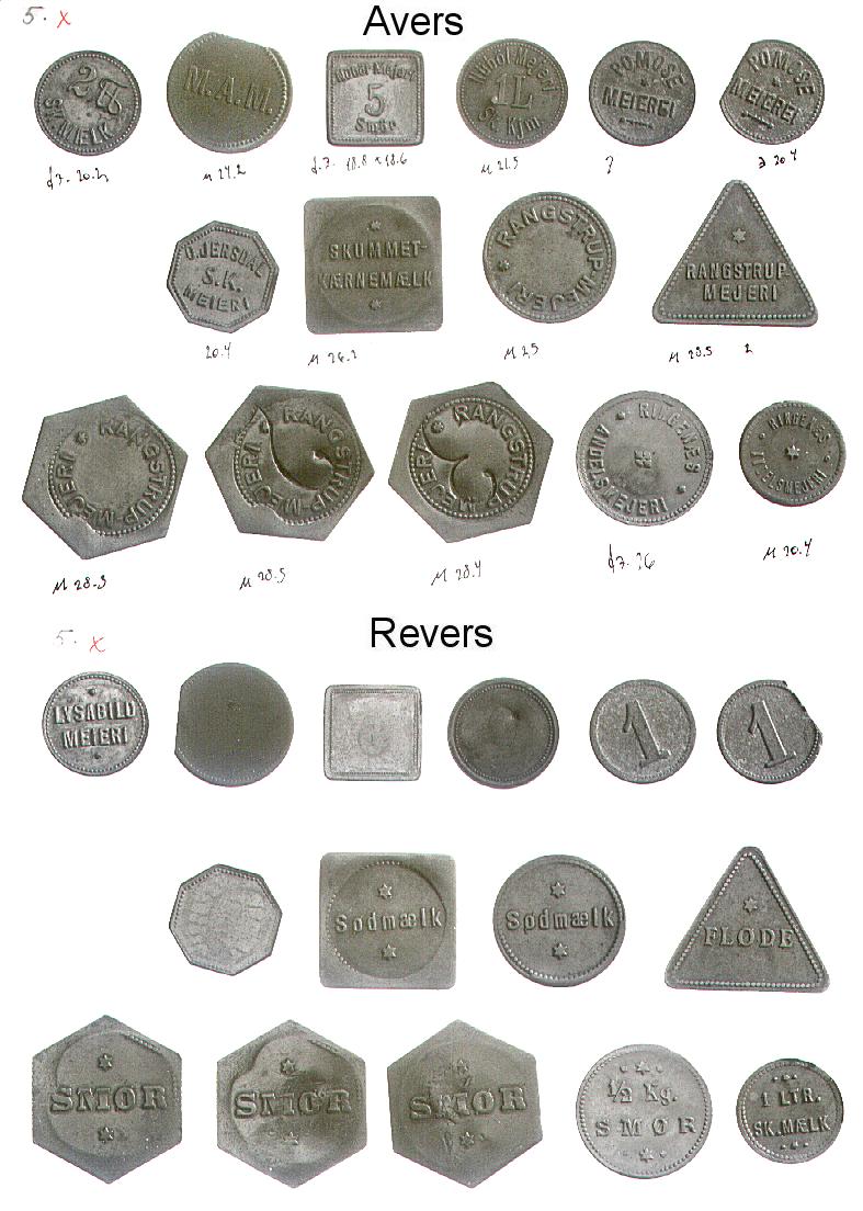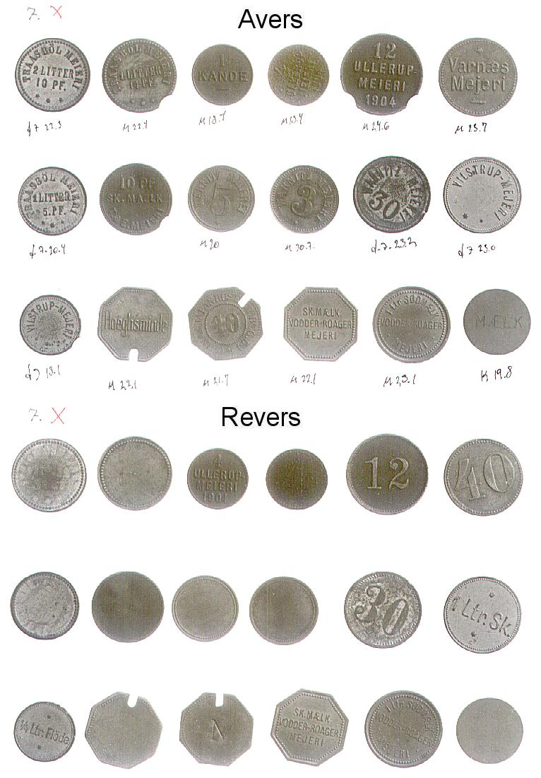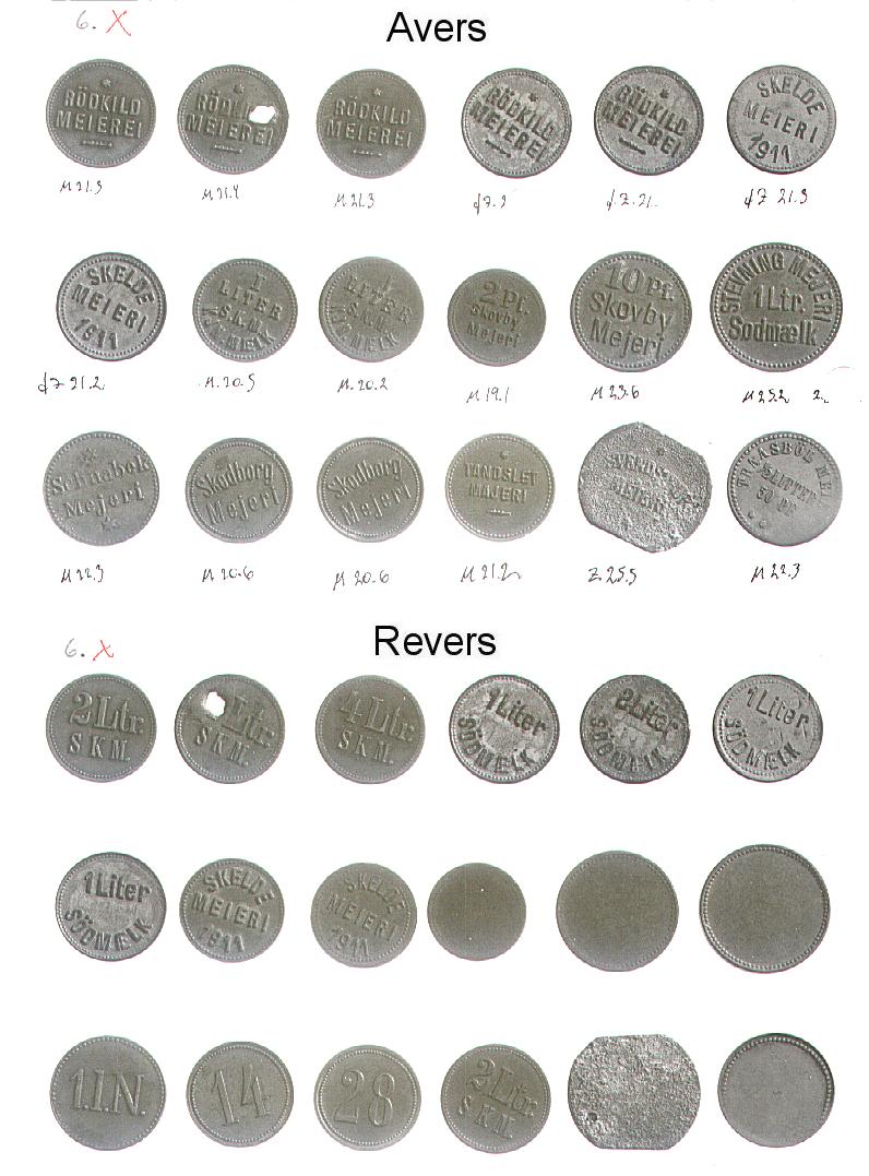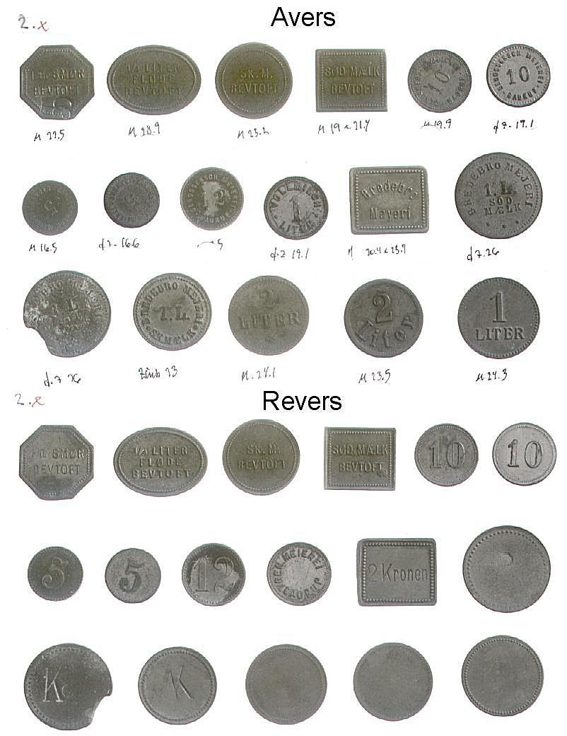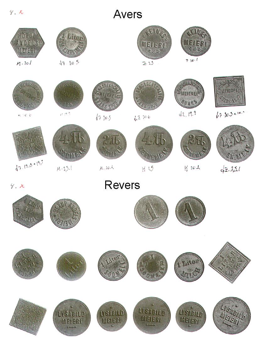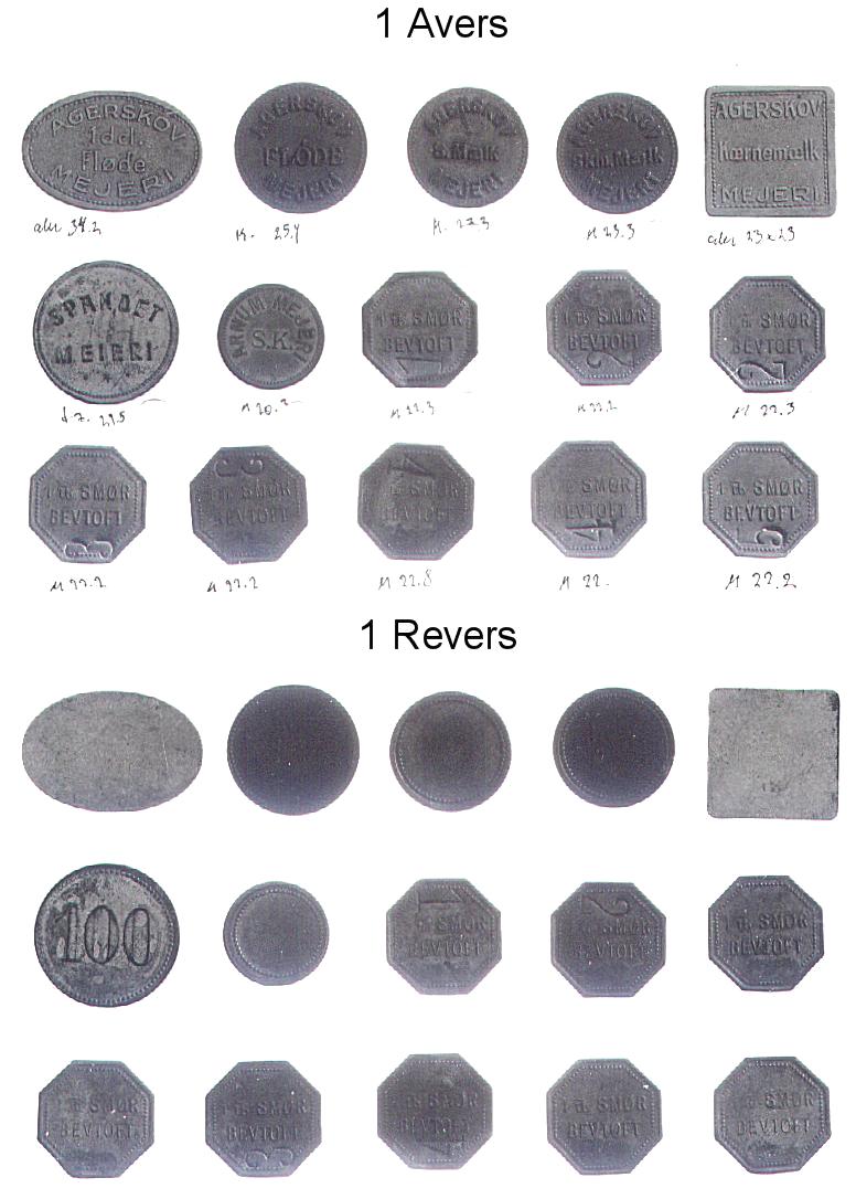 [Note fra Dansk Mønt: Nedenstående klikbare referencer henviser til 16 plancher med fotos af Mejeritegnene. Stykkerne vises i 3 rækker (forsider), herunder i 3 rækker (bagsider) i samme rækkefølge. En reference som fx. 01,1,2 skal forstås således, at stykket befinder sig på planche 01, række 1 nummer 2 fra venstre. Fotos: Elswing, KM&MS]