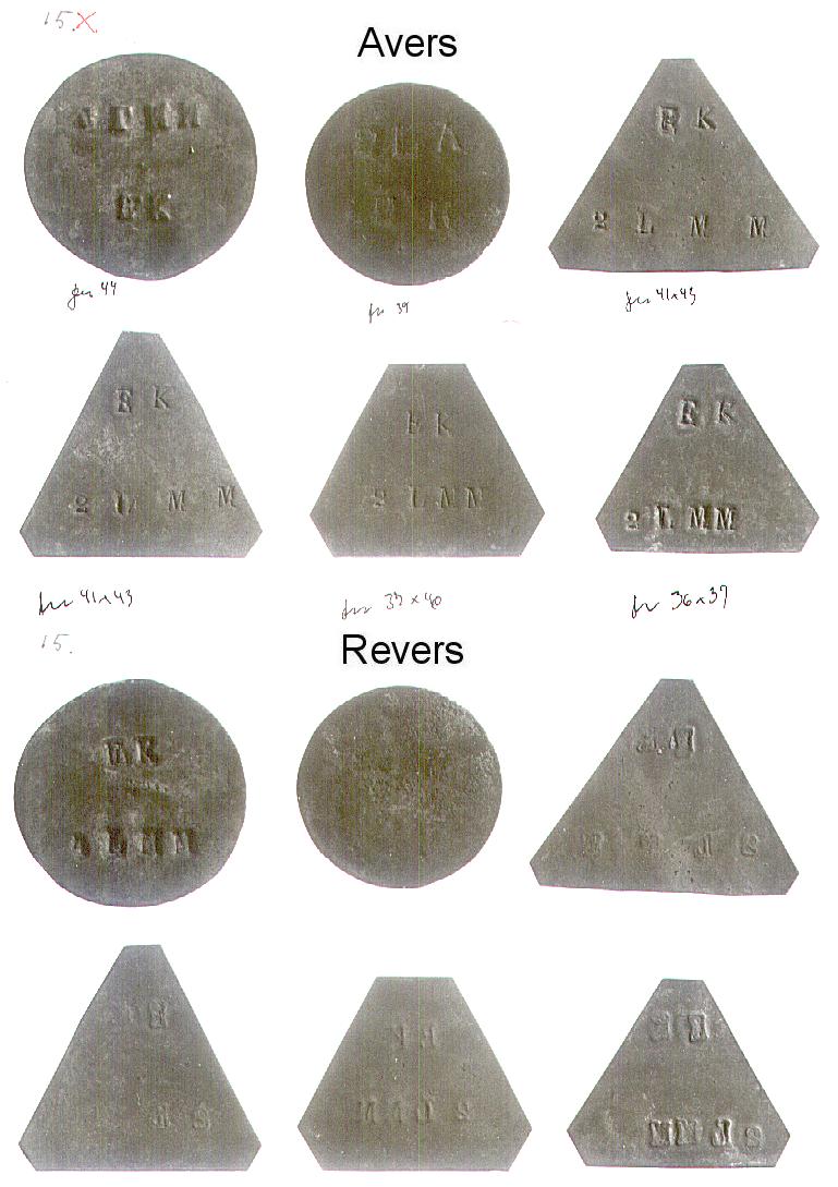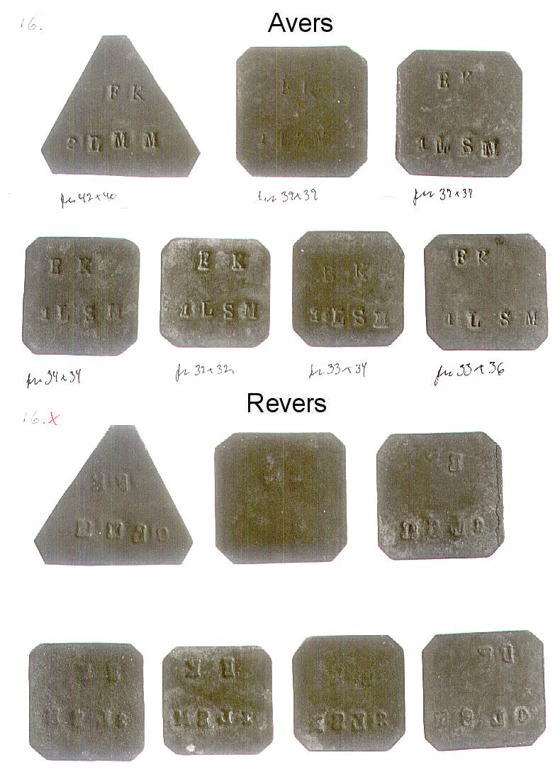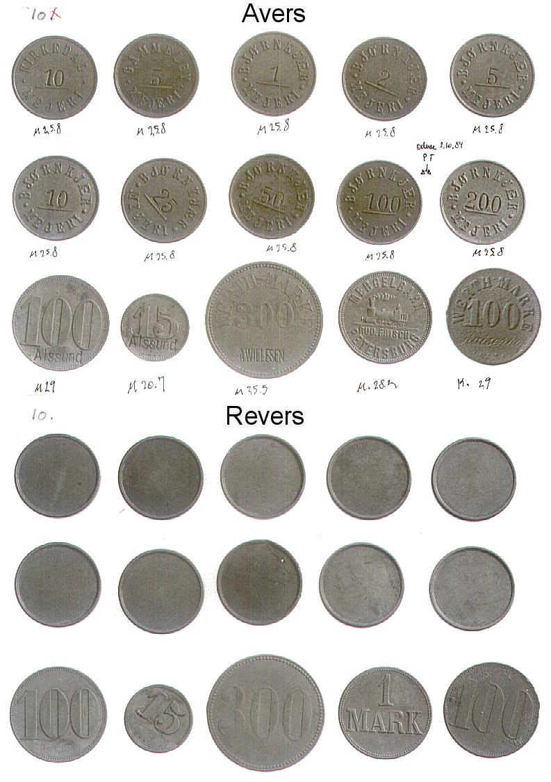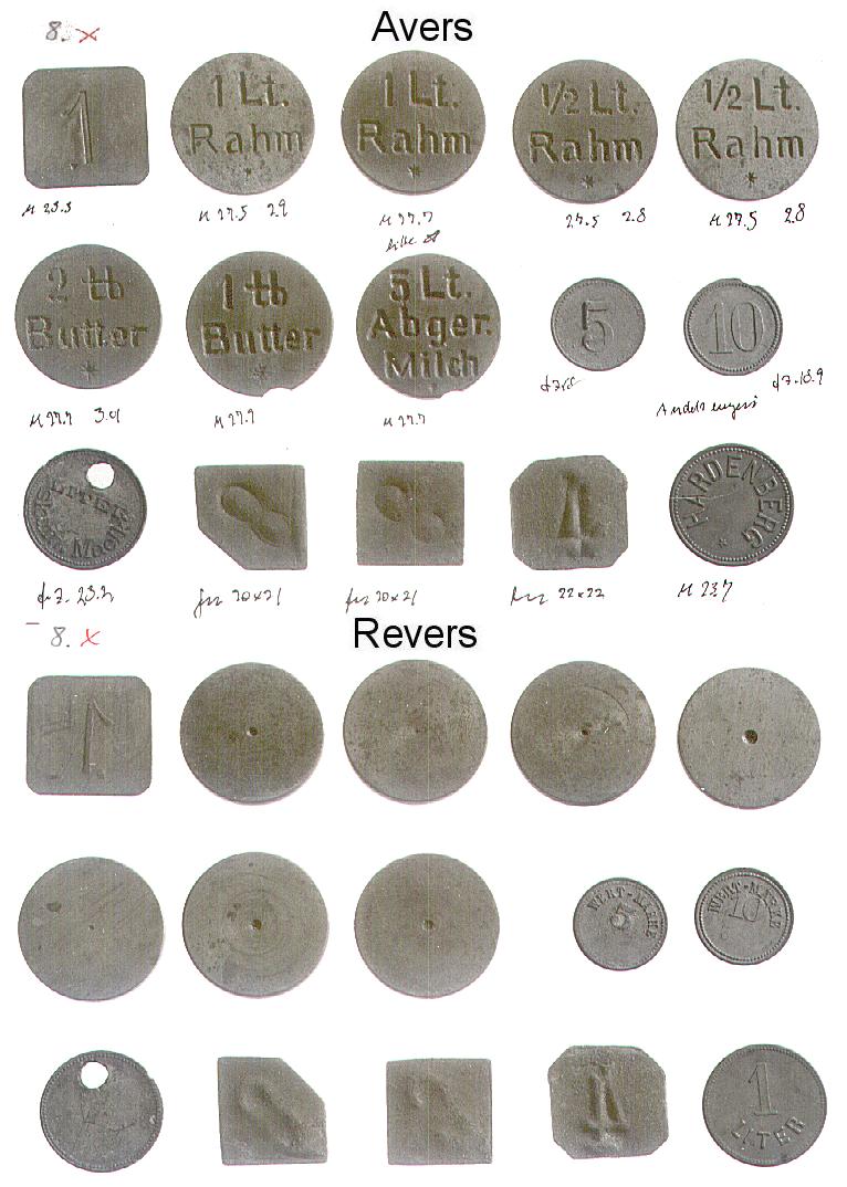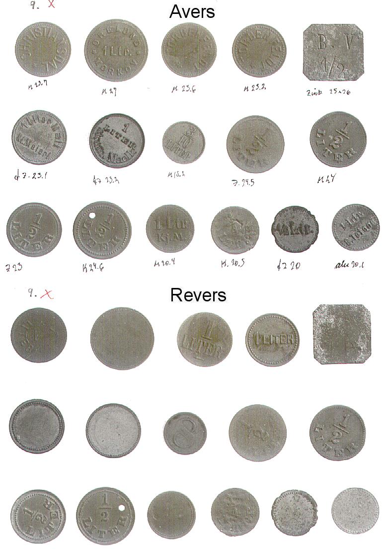 [Note fra Dansk Mønt: Nedenstående klikbare referencer henviser til 16 plancher med fotos af Mejeritegnene. Stykkerne vises i 3 rækker (forsider), herunder i 3 rækker (bagsider) i samme rækkefølge. En reference som fx. 01,1,2 skal forstås således, at stykket befinder sig på planche 01, række 1 nummer 2 fra venstre. Fotos: Elswing, KM&MS]