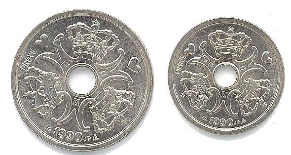 Øverste illustration viser en prøvemønt fra Christian 10.s regeringsjubilæum i 1937. Den er beskrevet i to af de nedenfor anførte artikler af Jørgen Sømod. Nederste illustration viser to prøver på Margrethe 2.s dagligserie fra 1990erne.